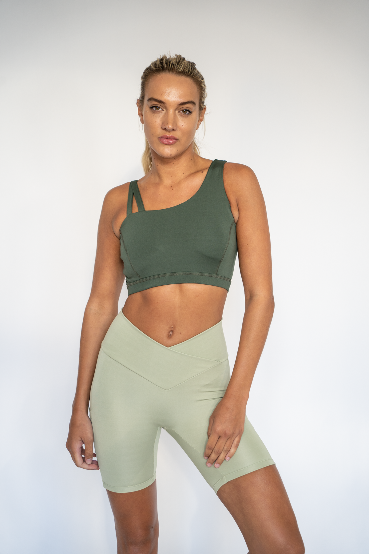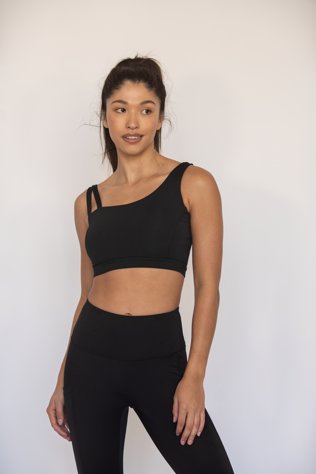This Evia Asymmetrical Sports bra offers a secure, comfortable fit thanks to four-way stretch fabric and a double-layer construction. The removable cups and elastic bottom band provide additional support during medium-to-high impact activities while sweat-wicking fabric keeps you dry. Asymmetrical straps provide increased comfort and mobility.